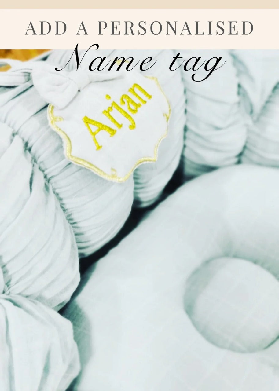 The Cloud comes with it’s own built in mosquito net , pom pom tulle hanging and a donut pillow . A personalised Name Tag , and